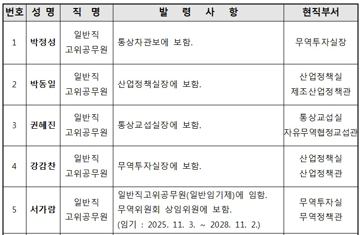 통상차관보 박정성·산업정책실장 박동일·통상교섭실장 권혜진·무역투자실장 강감찬·무역위 상임위원에 서가람